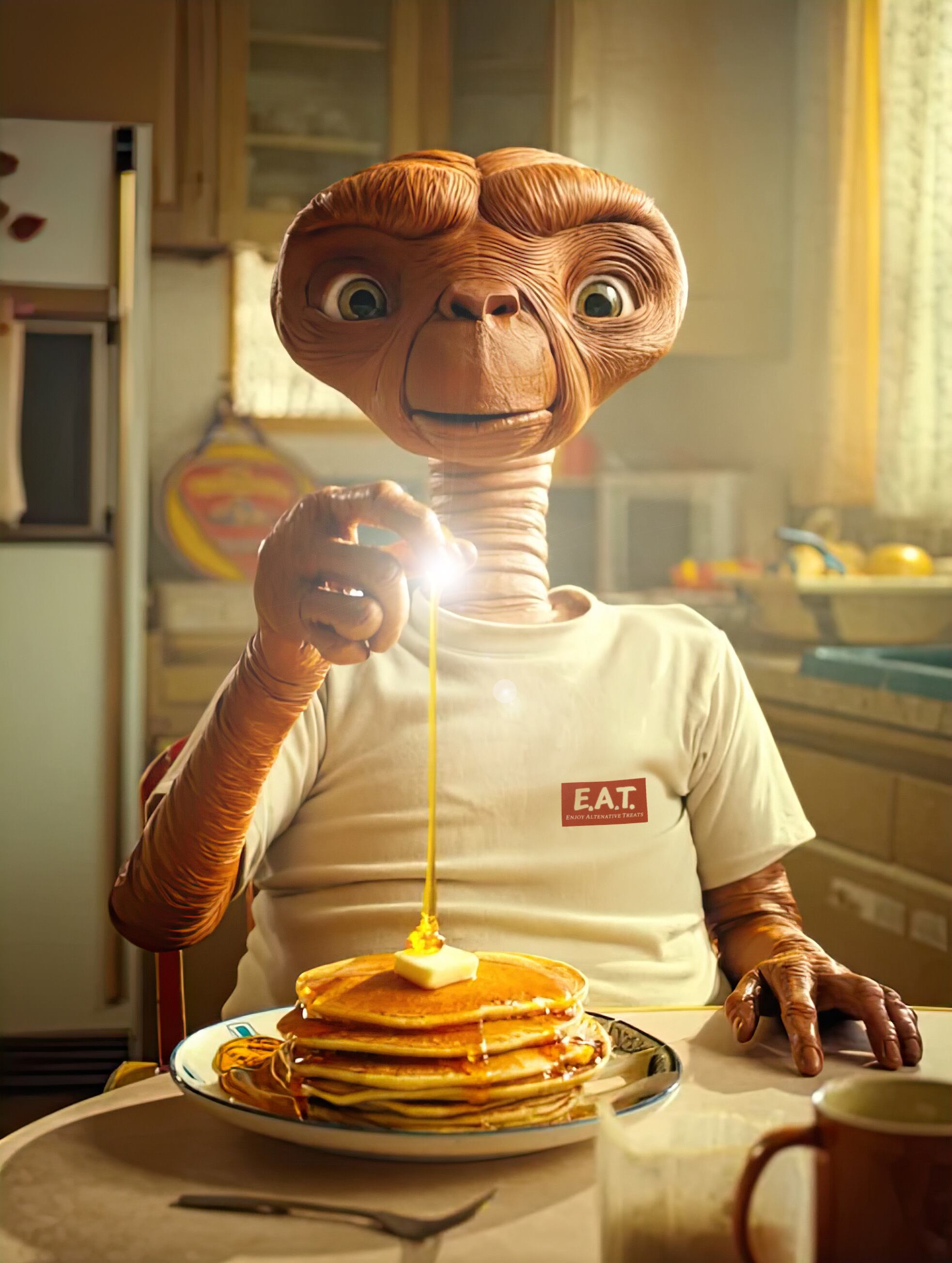 「満腹から平和を」をスローガンに、「食べる楽しさ」が続く世界を目指し発足したE.A.T.(イー.エー.ティー.) のオフィシャルTシャツ。まだ体験したことのない食との出会いを楽しむデザインということで、大好きな映画 E.T. をモチーフにしたデザインです。